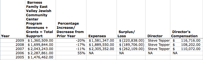 So here is where the story gets more interesting, at least for me. According to the Jewish News, the East Valley JCC’s President, a Mr. Steve Tepper, (Click here for article) would not give a reason for the name change, and when he was specifically asked whether or not the Barness Family paid their pledges, Mr. Tepper replied: “We do not release the financial records of the JCC or its donors.” So, another high handed statement from a leader of a community institution, and a statement that is completely untrue. Like all 501c3’s not attached to a house of worship, the East Valley JCC files an IRS 990 form that is available for inquiring minds that gives a pretty detailed look at their financial operations (download 2007, 2008, and 2009 filings here).